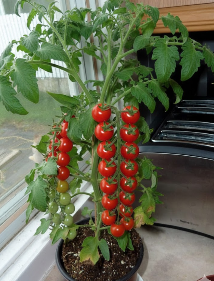Перша хвиля в мене прийшла приблизно на 21–23 день після того, як я переставила рослину в більший горщик. Це були маленькі, дуже ранні черрі — десь 15–20 плодів з куща, але для першого заходу це нормально.