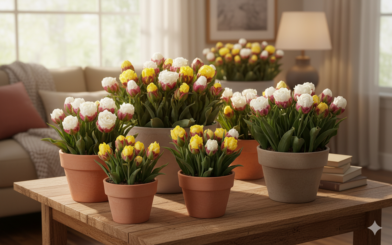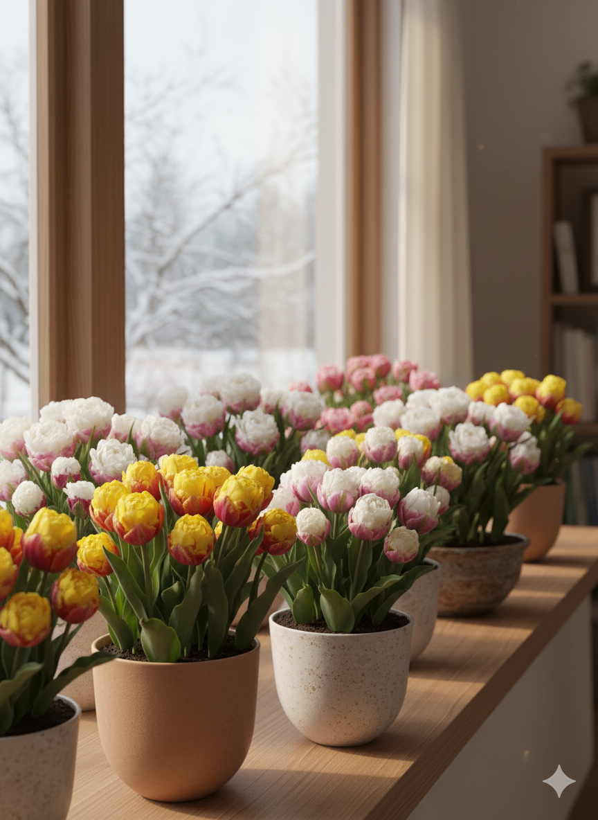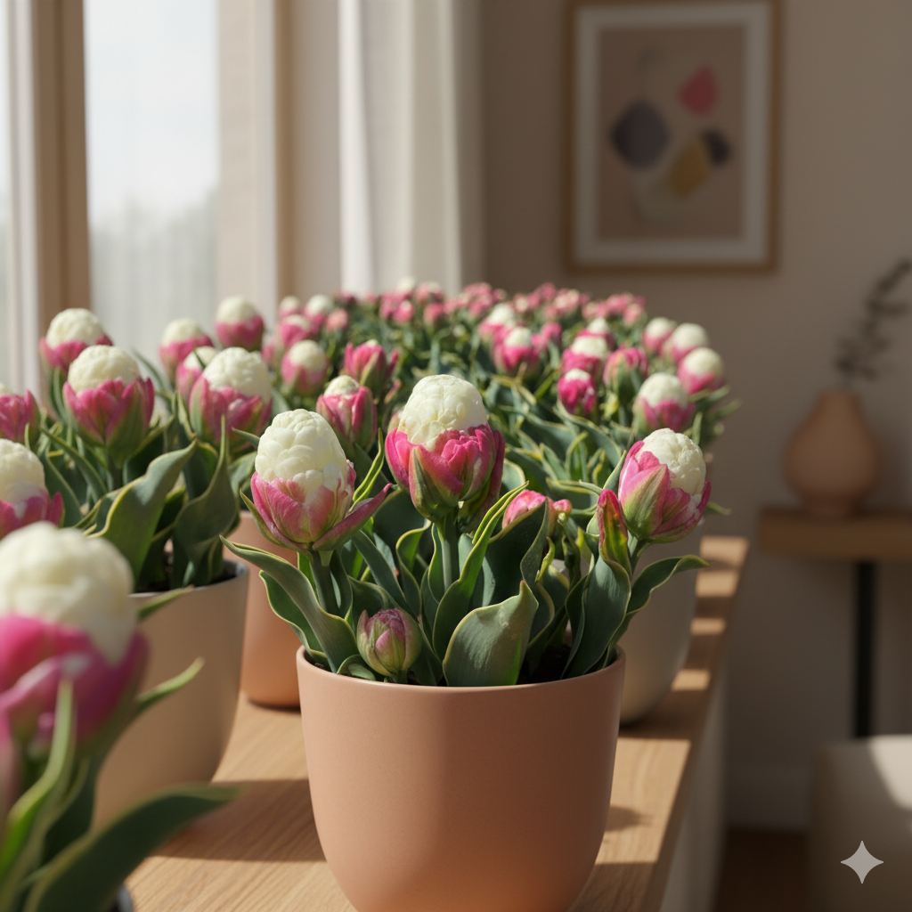 Для успішного вирощування тюльпанів «Ice Cream» у кімнатних умовах оберіть світле місце з м’яким, розсіяним освітленням.